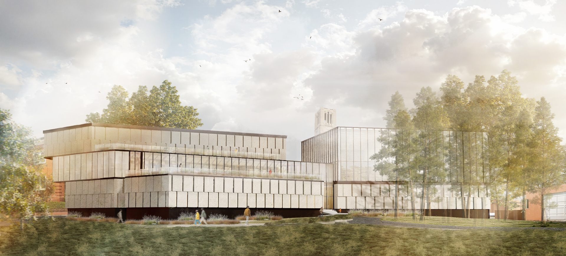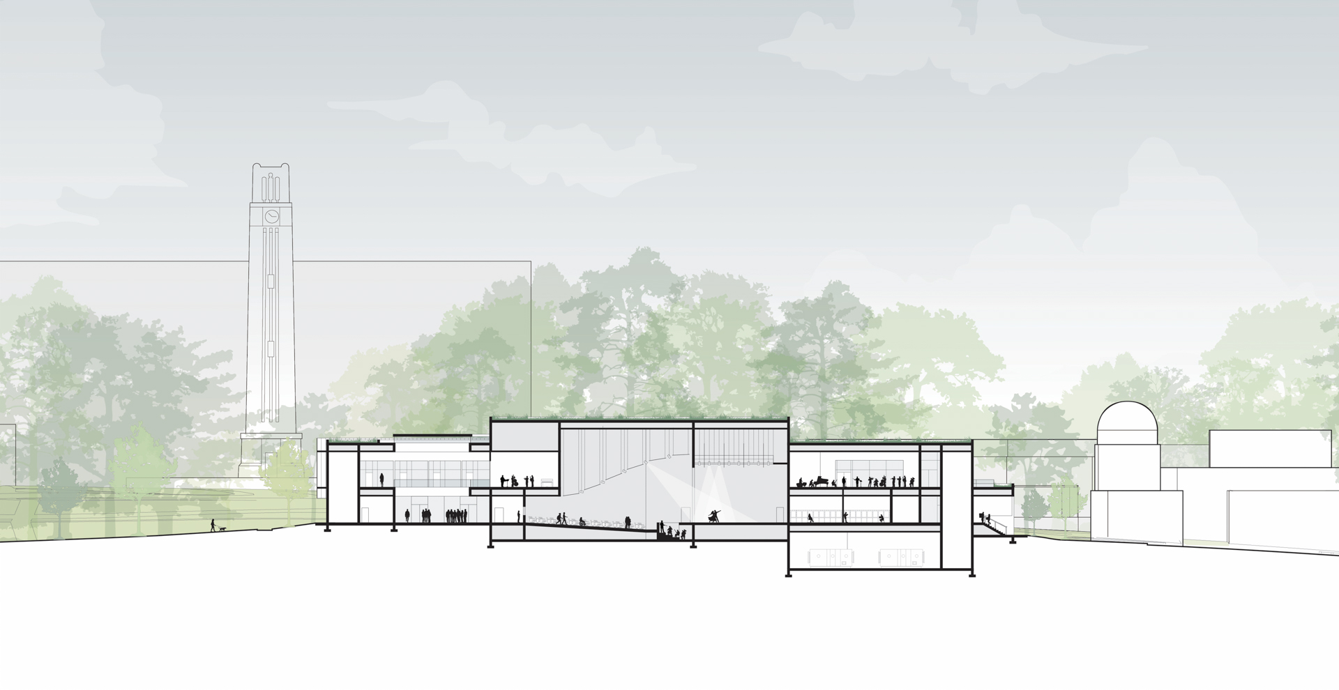 A central glass atrium connects two building wings, creating visual and physical links between the urban campus and the surrounding green space. Along Pullen Road, the building rises to frame views of the NC State Belltower. Toward the park, it steps down, shifting scale to create a more human-centered approach. A stone ribbon facade reinforces this transition, grounding the park edge while increasing translucency toward campus.